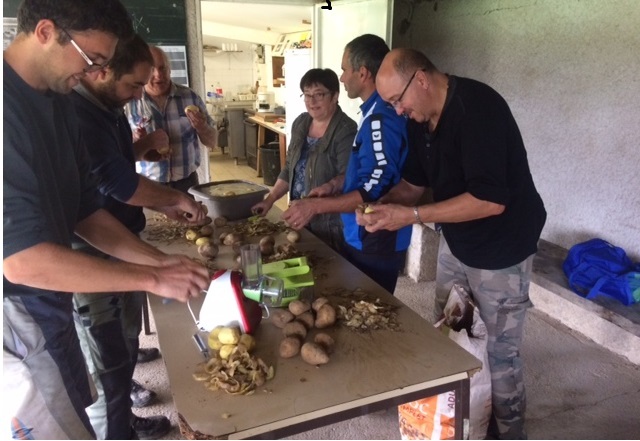 Enfin corvée .........Avec Gisele la co-présidente à l'eplucheur et une partie des dirigeants, c'est dans une bonne ambiance conviviale que les 25 kg de pommes de terres ont été épluchés afin de régaler demain tous les participants de la journée casse croute organisée par le club.