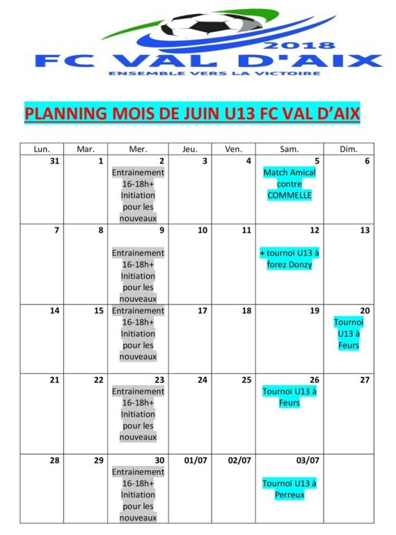 PLANNING U13 JUIN
